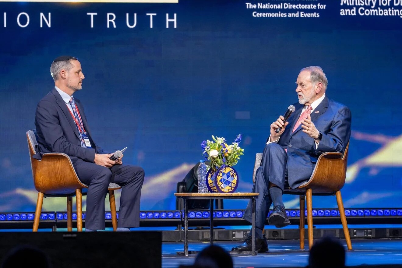 • U.S. Ambassador to Israel Mike Huckabee speaks with Alex Traiman, CEO of the Jewish News Syndicate during the International Conference on Combating Antisemitism in Jerusalem, Jan. 27, 2026. Photo by Matt Kaminsky/JNS.